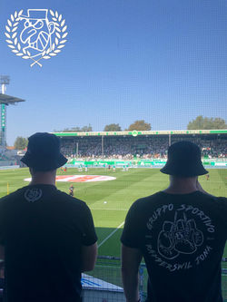 Die Fahrt verlief dann auch recht entspannt und so kam man ziemlich zeitig in Fürth an. Nachdem die Sachen aus dem Bus geladen und die Tickets an der Tageskasse gekauft waren, konnte es dann eigentlich mit dem üblichen Ablauf, wie z.B. dem Aufhängen der Zaunfahnen losgehen... Die Bestände an Tape waren allerdings bei allen 3 Gruppen leider aufgebraucht und so musste man sich erstmal ein bisschen rumfragen. Glücklicherweise konnte dann jedoch noch eine Rolle organisiert werden und alles hat am Ende seinen Platz gefunden.